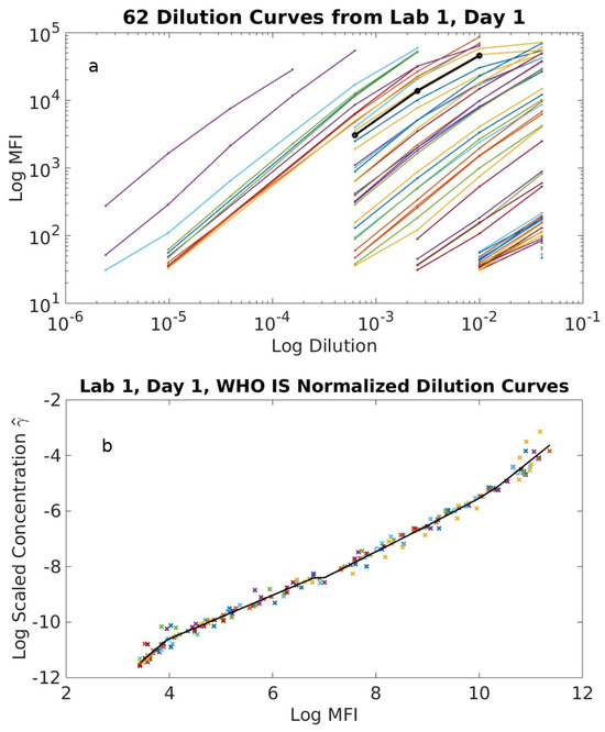Figure 1a shows the ‘Day 1’ measured dilution curves for all 62 samples along with the WHO IS obtained by one lab. Figure 1b illustrates the corresponding data collapse onto the dilution curve of the WHO IS. Note that we rotated the mean fluorescence intensity (MFI)readout in Figure 1a to the horizontal axis of Figure 1b to streamline the normalization algorithm [24]. In Figure 1a, and as expressed by Equation (4), the magnitude of the translation factor on the log scale for each curve relative to that of the standard is equal in magnitude to the scaled antibody concentration This new analysis method inherently reduces many sources of variability, and surprisingly, we were able to determine values with precise uncertainty quantifications for what is generally thought to be semi-quantitative assays. We repeated this process for all combinations of standards and assays. The average log antibody concentration, determined from measured on separate days, was used in all subsequent analyses.