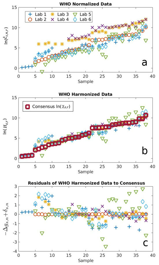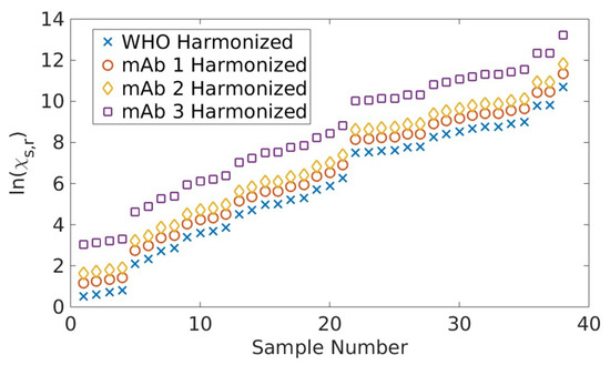 Figure 2 shows the results from all participants normalized and harmonized to the WHO IS using the new analysis methods described above (Equations (4)–(6)), where the samples are ordered from the lowest to largest value of log antibody consensus concentration. The average of each log concentration normalized to the WHO IS clearly shows a systematic bias for each assay relative to the others that corresponds to the systemic bias (Figure 2a). The consensus antibody concentrations cs,r determined using Equation (5) are shown as red squares along with harmonized antibody concentrations , as shown in Figure 2b. The removal of contributions from clearly improved agreements among all laboratories, with the results better coalescing around cs,r. The randomness associated with assay- and sample-dependent uncertainties and , respectively, were quantified, where differences from different laboratories/methods are clear (Figure 2c).