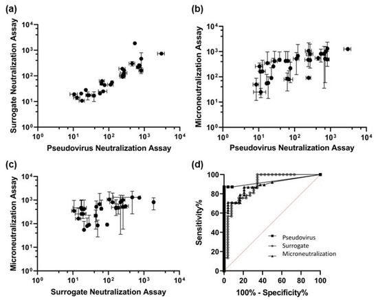 We further compared the three different neutralization assays using receiver operating characteristic (ROC) curves to evaluate the performance of the assays (Figure 4d) [26]. The optimal threshold for pvNT was an NT50 of 2.00, yielding a sensitivity of 87.2% and a specificity of 100%. There were no false positives reported, but some false negatives. For the surrogate assay, the optimal threshold based on the ROC curve was an NT50 of 8.87, with a sensitivity of 70.3% and a specificity of 92.3%. This optimal threshold is in good agreement with the LOD of 8.94 noted above. Lastly, the ROC analysis led to a determination of an optimal NT50 threshold of 47.50, with a sensitivity of 86.6% and a specificity of 79.2%, for MN. The values of the area under curve (AUC) were 0.931 for pvNT, 0.888 for the surrogate assay, and 0.885 for MN. A higher AUC indicates that an assay is better able to identify neutralization.