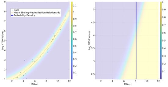 Considering pvNT as an optimal predictor of the presence of the neutralizing antibodies in this study, we constructed the probability model connecting consensus-binding concentrations to their neutralization counterparts. The left plot of Figure 5 shows the relationship expressed by Equation (8) for mAb 1 vs. the NT50 values from pvNT. It is notable that the mean relationship is not linear. The physical origins of this discrepancy are likely associated with the complexity of biological responses and point to the differing information content provided by the binding and neutralizing assays.