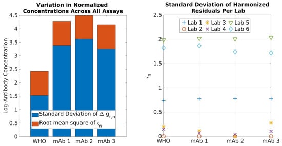 Figure 6 (left) examines the combined contribution from and in absolute values. Note that thermodynamics underpinning this led to the opposite sign of and in Equation (5); this means that their contributions can be canceled out if an improper experimental design is conducted when developing a reference. A comparison of the value determined when using the WHO IS versus an mAb provides a quantitative measure of the additional variability introduced when an mAb is used as the normalization standard (not the harmonization standard). In essence, mAbs can be used as a normalization standard, albeit with increased (~8x) variabilities as compared to WHO IS, consistent with the notion that a pooled sample serves as a better standard for normalization. However, this variation is all due to bias, which can be quantitatively removed, leaving as the only thermodynamic source of variability and therefore the identical performance of mAb and pooled convalescence standard via harmonization. Figure 6 (right) shows the per-lab estimate of the standard deviation in computed using each of the reference materials, an expansion of the orange portion of the Figure 6a that can be interpreted as the uncertainty in harmonized (i.e., bias-corrected) concentrations across the samples. Importantly, does not change (to within statistical uncertainty) according to the reference material, further supporting the notion that random bias arises from the samples and not from the reference interaction with the assay. By comparison, Labs 2, 3, and 4 demonstrated exceptional robustness/precision.