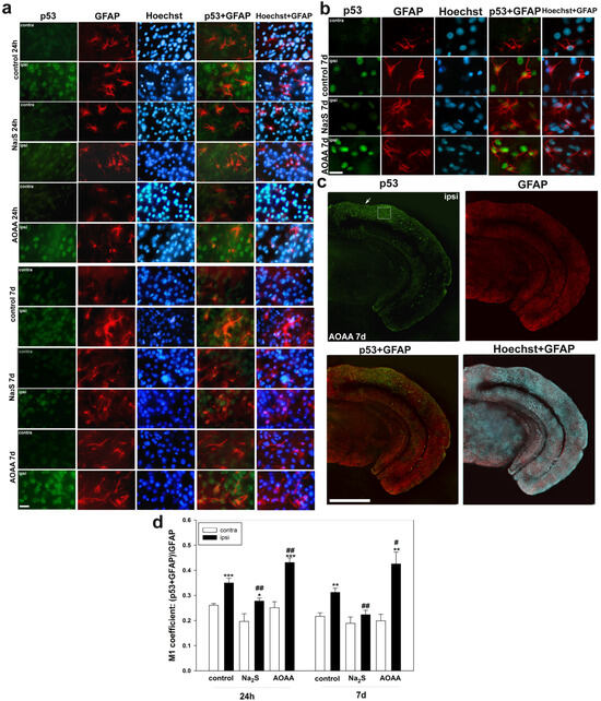 Immunofluorescence microscopy: (a) expression of p53 (green fluorescence) in the cerebral cortex of the control group, which was injected with saline, and experimental groups of animals that were injected with Na2S and AOAA, 24 h and 7 days after TBI. Scale bar 20 µm. (b) Expression of p53 (green fluorescence) in the cerebral cortex of the control group, which was injected with saline, and experimental groups of animals that were injected with Na2S and AOAA, 7 days after TBI. Scale bar 25 µm. (c) p53 expression (green fluorescence) in a brain section from an animal injected with AOAA, 7 days after TBI. The white square is the area for analysis of p53 expression. White arrow is the location of the injury. Scale bar 500 µm. (d) Coefficient M1 of p53 colocalization and GFAP neuronal nuclear marker in the contralateral and ipsilateral cortex of the control and experimental groups 24 h and 7 days after TBI. Scale bar 20 µm. Contra, contralateral cortex; Ipsi, ipsilateral cortex. GFAP+p53 and Hoechst+p53—overlap. Hoechst—Hoechst 33342 (blue fluorescence) fluorescence, which visualizes the nuclei of all cells, neurons and glia. One-way ANOVA. M ± SEM. n = 6. * p < 0.05, ** p < 0.01, *** p < 0.001—ipsilateral cortex relative to contralateral cortex of one animal; # p < 0.05, ## p < 0.01—ipsilateral cortex of the experimental group versus ipsilateral cortex of the control group within the same time period after injury.
