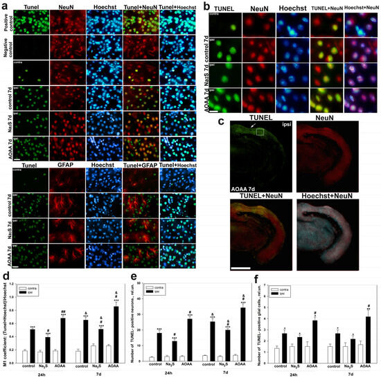 Immunofluorescence microscopy, TUNEL method. (a) Cortical sections stained with TUNEL, control group injected with saline, and experimental groups injected with Na2S and AOAA, 24 h and 7 days after TBI, as well as sections stained with TUNEL in the presence of nuclease benzonase (positive control) and in the absence of TdT (negative control). Scale bar 20 µm. (b) Cortical sections stained with TUNEL, control group injected with saline, and experimental groups injected with Na2S and AOAA, 7 days after TBI. Scale bar 25 µm. (c) Cortical section stained with TUNEL, experimental group injected with AOAA, 7 days after TBI. The white square is the analysis area for TUNEL-positive cells. White arrow is the location of the injury. Scale bar 500 µm. (d) M1 colocalization coefficient of TUNEL and Hoechst cell nuclear marker in the contralateral and ipsilateral cortex of the control and experimental groups 24 h and 7 days after TBI. (e) The number of TUNEL-positive neurons in the contralateral and ipsilateral cortex of the control and experimental groups after 24 h and 7 days of TBI. (f) The number of TUNEL-positive glial cells in the contralateral and ipsilateral cortex of the control and experimental groups after 24 h and 7 days of TBI. Scale bar 20 µm. Contra, contralateral cortex; Ipsi, ipsilateral cortex. TUNEL, nuclear marker of cell apoptosis (green fluorescence), NeuN, marker of neuronal nuclei or GFAP marker of astrocytes (red fluorescence); TUNEL+NeuN or TUNEL+GFAP and TUNEL+Hoechst—overlap. Hoechst—Hoechst 33342 fluorescence (blue fluorescence), which visualizes the nuclei of all cells, neurons and glia. One-way ANOVA. M ± SEM. n = 6. * p < 0.05, ** p < 0.01, *** p < 0.001—ipsilateral cortex relative to contralateral cortex of one animal; # p < 0.05, ## p < 0.01—ipsilateral cortex of the experimental group versus ipsilateral cortex of the control group within one time period after injury; and & p < 0.05—ipsilateral cortex of the control and experimental groups versus ipsilateral cortex of the same groups at different time intervals after TBI.