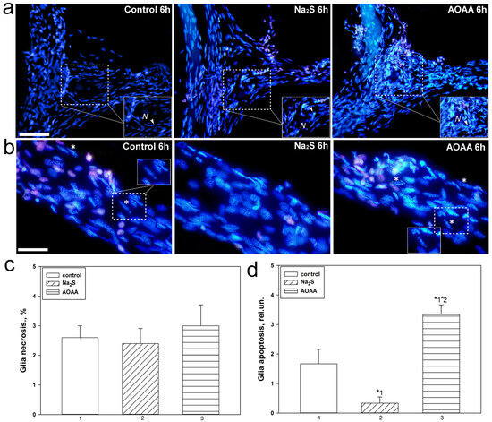 We studied the role of H2S in the necrosis and apoptosis of neurons and glial cells of crayfish Astacus leptodactylus during axotomy. In our study, the necrosis and apoptosis of neurons were not seen, and we barely did detected necrotic nuclei of glial cells stained with propidium iodide (Figure 7a,c). This pattern did not change with the use of Na2S and AOAA. However, we observed glial cell apoptosis (Figure 7b), which was significantly reduced by a factor of 5 with H2S donor (one-way ANOVA with Dunnett’s post hoc test, p < 0.05, Shapiro–Wilk test p = 0.392, Brown–Forsythe test p = 0.055) and increased almost 2 fold (one-way ANOVA with Dunnett’s post hoc test, p < 0.05, Shapiro–Wilk test p = 0.497, Brown–Forsythe test p = 0.260) when using a CBS inhibitor relative to control drugs 6 h after axotomy. Significant differences were also obtained between groups using Na2S and AOAA: the level of glial apoptosis increased in CSR incubated with AOAA, relative to preparations that were incubated with Na2S, by 11 fold (Kruskal–Wallis H-test, p < 0.05, Shapiro–Wilk test p < 0.05, Brown–Forsythe test p = 0.243) (Figure 7d).