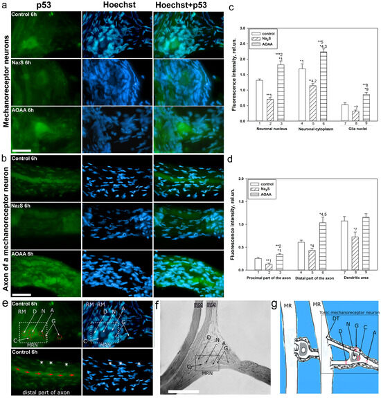 Immunofluorescence microscopy. (a) Expression of p53 (green fluorescence) in the stretch receptor of crayfish of the control group and experimental groups that were incubated with Na2S and AOAA, 6 after axotomy. (b) p53 expression (green fluorescence) in the distal axon region of the MRN of the control group and experimental groups that were incubated with Na2S and AOAA, 6 after axotomy. (c) p53 fluorescence intensity in the nucleus and cytoplasm of MRN, as well as in the nucleoplasm of glial cells 6 h after axotomy. (d) p53 fluorescence intensity in the proximal and distal portion of the axon, as well as in the dendritic region of the MRN. (e) Expression of p53 in the stretch receptor of crayfish and distal portion of the axon. (f) Crayfish stretch receptor in transmitted light. (g) Schematic of the crayfish stretch receptor. RM—receptor muscle; N—neuron nucleus; C—cytoplasm; D—dendrites; A—axon; G and white stars—glial cells; red arrows—p53 cord inside the axon; Hoechst+p53—overlap. Hoechst-Hoechst 33342 fluorescence, which visualizes the nuclei of all cells, neurons and glia. Scale bar 40 µm. One-way ANOVA. M ± SEM. n = 6. * p < 0.05, ** p < 0.01, *** p < 0.01.