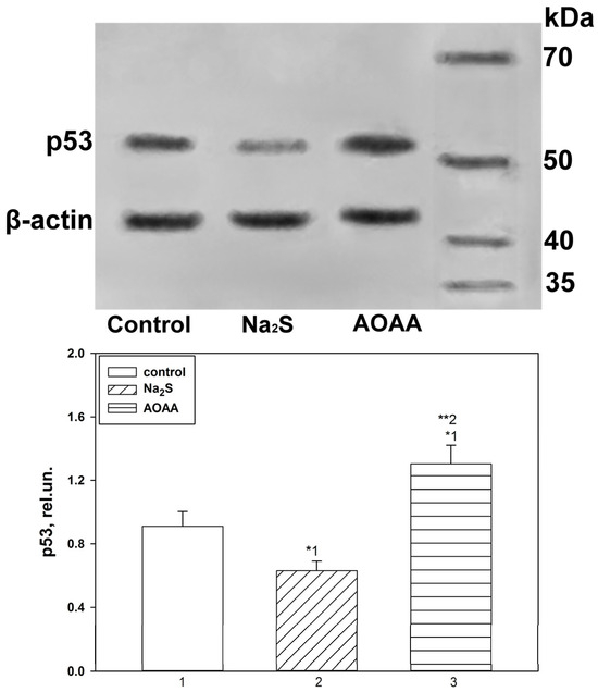 The fluorescence microscopy data confirm the results obtained during the Western blot analysis of the total fraction of the VNC nervous tissue of the control and experimental groups, which were incubated with Na2S and AOAA (Figure 9). Thus, it was shown that p53 expression in samples incubated with Na2S and AOAA decreased by 49% (one-way ANOVA with Dunnett’s post hoc test, p < 0.05, Shapiro–Wilk test p = 0.691, Brown–Forsythe test p = 0.510) and increased by 42% (one-way ANOVA with Dunnett’s post hoc test, p < 0.05, Shapiro–Wilk test p = 0.65, Brown–Forsythe test p = 0.546) relative to control 6 h after axotomy, respectively. Significant differences in the level of p53 were also obtained between the experimental groups (one-way ANOVA with Dunnett’s post hoc test, p < 0.01, Shapiro–Wilk test p = 0.991, Brown–Forsythe test p = 0.162) (Figure 9).