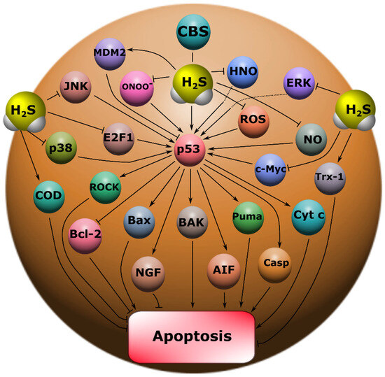 To date, many proapoptotic proteins are known that form a complex network of cell death signaling pathways. However, among them there are also key proteins that occupy a central position in the regulation of apoptotic signaling, one of which is p53 [4]. This protein is a transcription factor that triggers the transcription of many proapoptotic genes, and can also implement its program by transcription-independent mechanisms, in particular by regulating mitochondrial functions and triggering apoptosis in cells with mitochondrial deficiency. Its level under normal conditions in the cell is usually maintained low due to its proteasome degradation as a result of ubiquitination by the enzyme ubiquitin protein ligase E3 (MDM2). However, in pathological conditions, including traumatic brain injury and axotomy, the level of p53 increases dramatically, which can lead to cell death. In this regard, of particular interest is the search for signaling mechanisms that can effectively regulate p53 expression [5,6,7]. H2S may be a potential candidate.