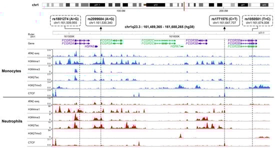 Epigenetic Landscape of the FCGR Locus in Monocytes and Neutrophils. The presence of epigenetic marks (ATAC-seq, H3K4me1, H3K4me3, H3K27ac, and H3K27me3) and CTCF transcription factor binding profiles for rs1771575, rs2099684, rs1801274, and rs1050501 in blood monocytes and neutrophils were visualized using the CistromeDB database in conjunction with the WashU epigenome browser. The genomic location of the FCGR locus on chromosome 1q23 is depicted as a red line. For both monocytes (upper panel) and neutrophils (lower panel), the following data is displayed: ATAC-Seq peaks, CTCF (CCCTC-binding factor) binding sites, ChIP-seq peaks, and Histone modifications associated with active regulatory regions: H3K4me1, H3K4me3, H3K27ac, and H3K27me3. The variant rs2099684 is situated within an active enhancer, whereas rs1771575 is found within both an active enhancer and a CTCF binding site. Additionally, the known coding variants rs1801274 and rs1050501 are also represented.
