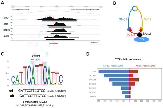 Alteration of transcription factor binding sites at position rs1771575. (A) ChIP-seq experiments in GM12878 (B-LCL Cell Line). ChIP-seq experiments were conducted in the GM12878 (B-LCL) cell line, revealing that ZNF24, CTCF, and cohesin subunits RAD21 and SMC3 bind to rs1771575. (B) Schematic interaction between CTCF and the cohesin complex. A schematic representation demonstrates the interaction between CTCF and the cohesin complex. (C) Position weight matrix of ZNF24 binding. The position weight matrix analysis of ZNF24 binding indicates a preference for binding to chromatin in the presence of the reference allele (C) of rs1771575. p-values for each putative site and their ratio (pval_ratio = worst_pval/best_pval) were calculated using the RSAT ‘scan variations’ tool. JASPAR matrix ID and genomic coordinates (GRCh38) are also provided. (D) CTCF binding ChIP-seq analysis. Analysis of ChIP-seq data for CTCF binding using read counts from several immune cell lines demonstrates allele-specific binding. The number of mapped reads carrying rs1771575-C is significantly different in the presence of the alternative allele, indicating an allele-specific binding event. These data were obtained from the ADASTRA database.