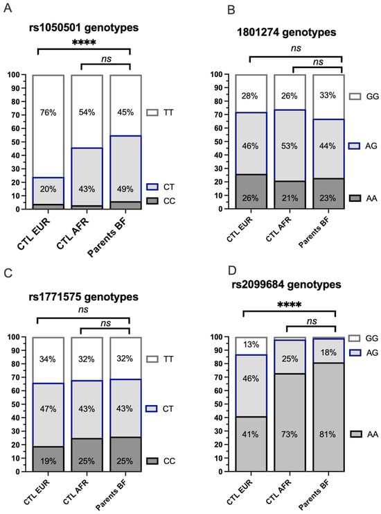 Comparison of genotype frequencies of the analyzed variants among individuals from Europe, Africa (1000 Genomes Project), and the study population from Burkina Faso (Bobo ethnic group). (A) Distribution of the coding FCGR2B rs1050501 genotype. The distribution of the coding FCGR2B rs1050501 genotype was analyzed in individuals from European (CTL EUR), African (CTL AFR), and unique parents from the study cohort enrolled in Burkina Faso. CC: The individual has two copies of the C allele at rs10505501, encoding an isoleucine (I) in the transmembrane domain of the FCgR2B receptor. CT: The individual has one copy of the C allele and one copy of the T allele at rs10505501.TT: The individual has two copies of the T allele at rs10505501, which encodes a threonine (T) at position 232. **** p < 10−4; Ns: non significative. (B) Distribution of the coding FCGR2A rs1801274 genotype. The distribution of the coding FCGR2A rs1801274 genotype was examined in individuals from European (CTL EUR), African (CTL AFR), and unique parents from the study cohort enrolled in Burkina Faso. AA: The individual has two copies of the A allele, encoding a histidine (I) in exon 4 of the FcγR2A receptor. AG: The individual has one copy of the A allele and one copy of the G allele. GG: The individual has two copies of the G allele, resulting in an arginine substitution (R) at position 131. (C) Distribution of the rs1771575 regulatory variant genotype. The distribution of the rs1771575 regulatory variant genotype was assessed in individuals from European (CTL EUR), African (CTL AFR), and unique parents from the study cohort enrolled in Burkina Faso. CC: The individual has two copies of the C allele. CT: The individual has one copy of the C allele and one copy of the T allele. TT: The individual has two copies of the T allele. (D) Distribution of the rs2099684 regulatory variant genotype. The distribution of the rs2099684 regulatory variant genotype was investigated in individuals from European (CTL EUR), African (CTL AFR), and unique parents from the study cohort enrolled in Burkina Faso. AA: The individual has two copies of the A allele. AG: The individual has one copy of the A allele and one copy of the G allele. GG: The individual has two copies of the G allele.