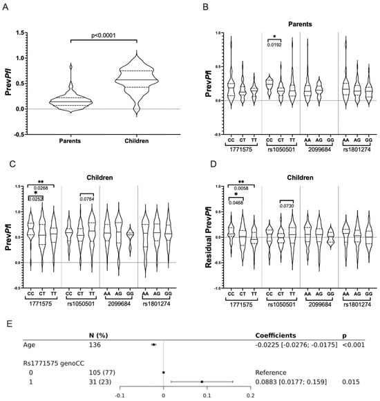 Prevalence of P. falciparum Infection (PrevPfI) Across Variant Genotypes in Infants and Adults from Burkina Faso. (A) Comparative analysis of P. falciparum infection prevalence (PrevPfI) in parents and children. A comparative analysis of P. falciparum infection prevalence (median PrevPfI values) was conducted in parents and children using the nonparametric Mann–Whitney U-test for non-normally distributed data. Significant p-values (≤0.05) are indicated. The prevalence of P. falciparum infection (PrevPfI) for each individual was calculated as the number of positive blood samples divided by the total number of blood samples evaluated for each individual. This was considered the quantitative phenotype outcome variable. (B) Comparative analysis of P. falciparum infection prevalence (PrevPfI) in parents across rs1771575, rs1050501, rs2099684, and rs1801274 genotypes. A comparative analysis of P. falciparum infection prevalence (median PrevPfI values) in parents was performed across rs1771575, rs1050501, rs2099684, and rs1801274 genotypes. Significant p-values (<0.05) are indicated, and trends (p < 0.100) are indicated in italics. * refers to p values ≤ 0.05. (C) Comparative analysis of P. falciparum infection prevalence (PrevPfI) in children across rs1771575, rs1050501, rs2099684, and rs1801274 genotypes. A comparative analysis of P. falciparum infection prevalence (median PrevPfI values) in children was conducted across rs1771575, rs1050501, rs2099684, and rs1801274 genotypes. Significant p-values (<0.05) are indicated, and trends (p < 0.100) are indicated in italics. * refers to pvalues ≤ 0.05, ** refers to p values ≤ 0.01 (D) Comparative analysis of residual P. falciparum infection prevalence (PrevPfI adjusted for age effect) in children across rs1771575, rs1050501, rs2099684, and rs1801274 genotypes. A comparative analysis of residual P. falciparum infection prevalence (median PrevPfI values) adjusted for age effect was performed in children across rs1771575, rs1050501, rs2099684, and rs1801274 genotypes. Residuals of PrevPfI were calculated for each person after conducting a linear regression analysis between PrevPfI and age. * refers to p values ≤ 0.05, ** refers to pvalues ≤ 0.01 (E) Multiple linear regression analysis to test effect on outcome variable PrevPfI. Multiple linear regression was carried out to assess the effect on the outcome variable PrevPfI, taking into account age and the recessive model (CC: encoded 1) vs. (CT/TT: encoded 0) explanatory variables.