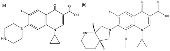 - LeBel, M. Ciprofloxacin: Chemistry, mechanism of action, resistance, antimicrobial spectrum, pharmacokinetics, clinical trials, and adverse reactions. Pharmacotherapy 1988, 8, 3–33. [Google Scholar] [CrossRef]