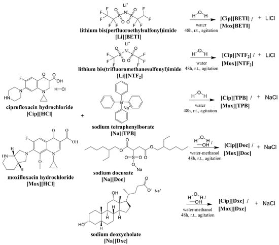 - Florindo, C.; Costa, A.; Matos, C.; Nunes, S.L.; Matias, A.N.; Duarte, C.M.; Rebelo, L.P.; Branco, L.C.; Marrucho, I.M. Novel organic salts based on fluoroquinolone drugs: Synthesis, bioavailability and toxicological profiles. Int. J. Pharm. 2014, 469, 179–189. [Google Scholar] [CrossRef]