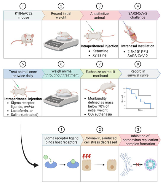 Schematic representation of survival studies in ACE2-transgenic mice post SARS-CoV-2 infection. (Top) The stepwise procedure entails: (1) Use of K18-hACE2 mouse model; (2) Recording of initial weight; (3) Anesthetizing with Ketamine and Xylazine; (4) Intranasal challenge with 2.5 × 104 PFU SARS-CoV-2; (5) Daily treatments with Sigma receptor ligands, Lactoferrin, or Saline (untreated); (6) Continuous weight monitoring; (7) Euthanasia upon reaching moribund state, defined as a mass below 70% of initial weight; and (8) Documentation of survival curve. (Bottom) Proposed action mechanism of Sigma receptor ligands: (1) Binding to host receptors; (2) Reduction of coronavirus-induced cell stress; and (3) Inhibition of coronavirus replication complex formation.