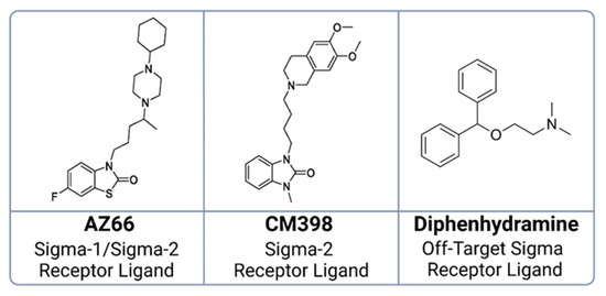 Chemical structures of ligands utilized in SARS-CoV-2 survival studies in mice. Displayed are the molecular structures of: AZ66, a dual sigma-1 and sigma-2 receptor ligand; CM398, specific to sigma-2 receptors; and diphenhydramine, recognized as an off-target sigma receptor ligand.
