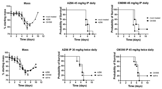 Animal work was carried out in the Animal Biosafety Level 3 (ABSL3) laboratory and was approved by the University of Florida Institutional Animal Care and Use Committee (IACUC) under IACUC protocol number 202111322. Six- to eight-week-old female K18-hACE2 mice were purchased from The Jackson Laboratory (Bar Harbor, ME, USA). K18-hACE2 mice are transgenic for the human ACE2 receptor and express it from the keratin 18 promoter to direct ACE2 expression to epithelia including airway epithelia. The mouse strain has been extensively characterized as a SARS-CoV-2 animal model, as their tissue-wide expression of human ACE2 ensures fulminant acute infections [10,11,55]. Mice were provided food and water ad libitum and housed in isolator caging. On the day of the challenge, the mice were weighed and then anesthetized by intraperitoneal (IP) injection of 100 μL of ketamine/xylazine (87.5/12.5 mg/kg) in saline. Fully anesthetized mice were challenged by intranasal instillation with 25 μL containing 2.5 × 104 plaque-forming units (PFU) of SARS-CoV-2. Each day thereafter, mice were observed for moribundity, and the mass of each mouse was recorded. Treatments were delivered by an IP injection of the drugs suspended in 100 μL of saline, or saline alone. Treatments were given once or twice daily depending on the experiment, and the doses were titrated based on previously reported drug pharmacokinetic profiles [51,53]. Mice were determined to be moribund if their mass fell below 70% of their starting mass and were euthanized with carbon dioxide.
