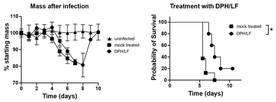 Impact of diphenhydramine/lactoferrin (DPH/LF) treatment on survival and weight loss in SARS-CoV-2-infected ACE2-transgenic mice. Mice were challenged with 2.5 × 104 PFU SARS-CoV-2 (UF-1) intranasally and administered either vehicle control (mock treated) or a combination of 30 mg/kg diphenhydramine and 50 mg/kg lactoferrin (DPH/LF) twice daily via intraperitoneal injection. Group sizes: n = 3 (uninfected), n = 8 (mock-treated), and n = 5 (DPH/LF treated). Left panel: Percentage of starting mass post-infection over 10 days comparing uninfected, mock-treated, and DPH/LF-treated mice. Right panel: Probability of survival over 10 days for mock treated and DPH/LF-treated mice. An asterisk denotes a significant difference in outcomes between mock treated and DPH/LFN-treated groups (p ≤ 0.05).