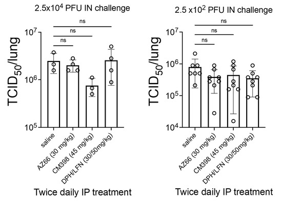 Quantitation of SARS-CoV-2 virus particles in the lungs of treated ACE2-transgenic mice. Mice were intranasally challenged with 2.5 × 104 PFU or 2.5 × 102 PFU SARS-CoV-2 (UF-1) and then treated with the vehicle control (saline), CM398 (sigma-2 receptor-specific ligand), AZ66 (sigma-1/sigma-2 receptor ligand), or diphenhydramine (sigma receptor ligand) combined with lactoferrin. The 50% tissue culture infectious dose (TCID50) was calculated based on lungs harvested 48 h after infection. An “ns” indicates non-statistically significant differences between treatment and placebo groups. Circles represent individual animals.