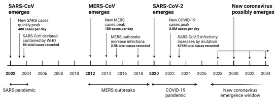 Coronaviruses of concern have emerged periodically since 2002 [12,13,14]. Based on this pattern, considering the continued lack of effective surveillance and prevention measures in Asian wet markets [15], it is prudent to anticipate new lethal coronavirus outbreaks with the potential to emerge in the near future (Figure 6). Although the infectious mechanism of the next coronavirus has yet to be revealed, there is a significant likelihood that it may have similar infectious advantages that were seen in SARS-CoV-2, such as the furin cleavage site.