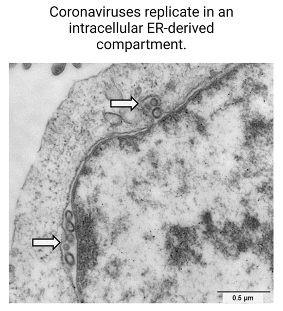 Coronaviruses replicate in an intracellular ER-derived compartment. Electron micrograph depicting the intracellular replication sites of coronaviruses within ER-derived compartments, as highlighted by arrows. Scale bar represents 0.5 µm [32].
