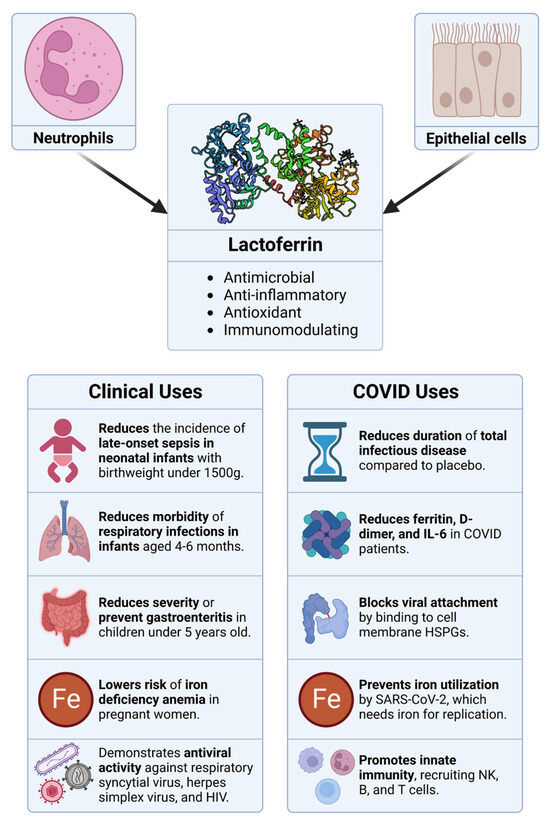Overview of the sources, properties, and therapeutic applications of lactoferrin. Originating from neutrophils and epithelial cells, lactoferrin boasts a range of bioactivities, including antimicrobial, anti-inflammatory, antioxidant, and immunomodulatory properties. The clinical utility of lactoferrin spans from managing neonatal infections to mitigating specific symptoms in COVID-19 patients, among other therapeutic applications.