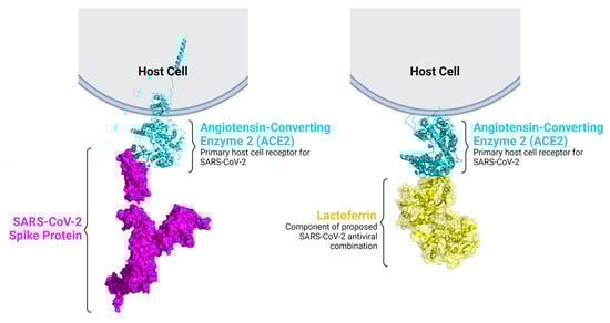 The model of the SARS-CoV-2 spike protein binding to ACE2 is based on the crystal structure of the SARS-CoV-2 spike protein complexed with ACE2 [56] (PDB 6M17). A structural model of ACE2 bound to lactoferrin was generated by HDOCK [57] using crystal structures of ACE2 [58] (PDB 1R42) and bovine lactoferrin [59] (PDB 1BLF).