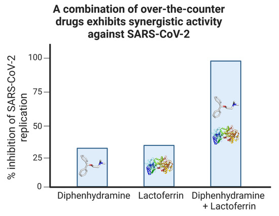 Synergistic inhibition of SARS-CoV-2 replication by a combination of non-prescription drugs. Vero E6 cells were subjected to infection with a SARS-CoV-2 isolate and subsequently treated with either diphenhydramine, lactoferrin, or a combination of both. The replication efficiency was evaluated by quantifying the SARS-CoV-2 genomic presence using PCR. Adapted with permission from Ref. [6]. 2021, MDPI.