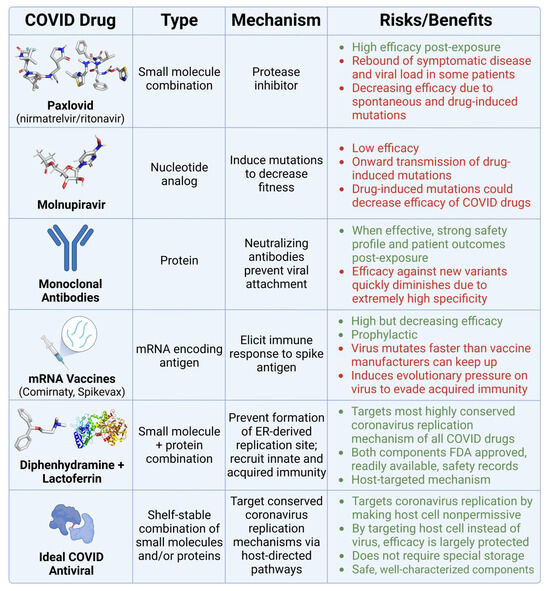 Comparison of COVID therapeutics. This table presents various COVID-19 drugs and their corresponding classification, mechanism of action, and associated risks (highlighted in red) and benefits (highlighted in green).