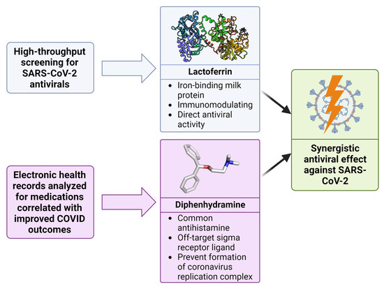 Discovery of synergy between lactoferrin and diphenhydramine against SARS-CoV-2. Utilizing high-throughput screening and analysis of electronic health records, both lactoferrin and diphenhydramine were identified as potential antiviral agents. When combined, these drugs demonstrate a potentiated, synergistic effect against SARS-CoV-2.