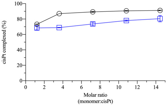 Fraction of cisPt coordinated by NaHA as a function of (monomer:drug) molar ratio for: high (HMW; black) and low molecular weight (LMW; blue).