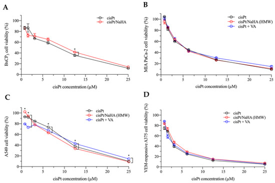 Concentration-dependent cytotoxicity of cisPt alone (black), cisPt/NaHA HMW (red), and cisPt + VA (blue) in: (A) BxPC3, (B) MIA PaCa-2, (C) A549, and (D) VEM-responsive A375 cell lines. Cell viability was determined by MTT assay after 48 h exposure to treatment. Data are reported as mean ± SEM (n = 6). Asterisks indicate a statistically significant difference (p < 0.05).