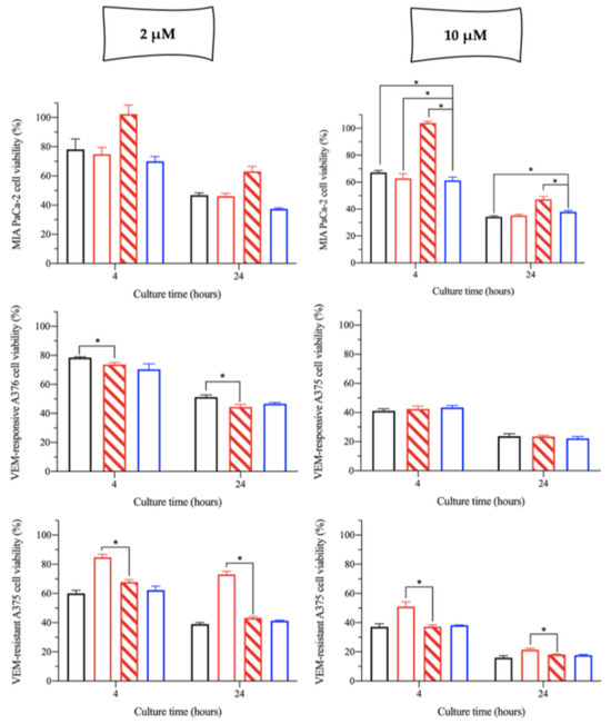 Cytotoxic effect of cisPt alone (black bar), cisPt/NaHA HMW (empty red bar) and cisPt/NaHA LMW (filled red bar), and cisPt + VA (blue bar) in MIA PaCa-2 (top plots), VEM-responsive A375 (middle plots), and VEM-resistant A375 (bottom plots). Cell viability was determined by MTT assay after 4 and 24 h exposure to 2 µM (left plots) and 10 µM (right plots) cisPt. Data are reported as mean ± SEM (n = 6). Asterisks indicate a statistically significant difference (p < 0.05).