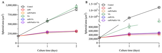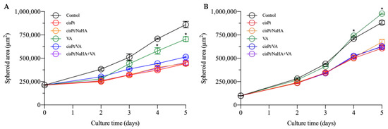 Area of VEM-responsive (A) and VEM-resistant (B) A375 spheroids as a function of culture time with various treatment groups: untreated control (black), cisPt alone (red), cisPt/NaHA HMW complex (orange), valproic acid (VA, green), cisPt + VA (blue), and cisPt/NaHA HMW + VA (purple). Data are reported as mean ± SEM (n ≥ 3). Asterisks indicate a statistically significant difference (p < 0.05).