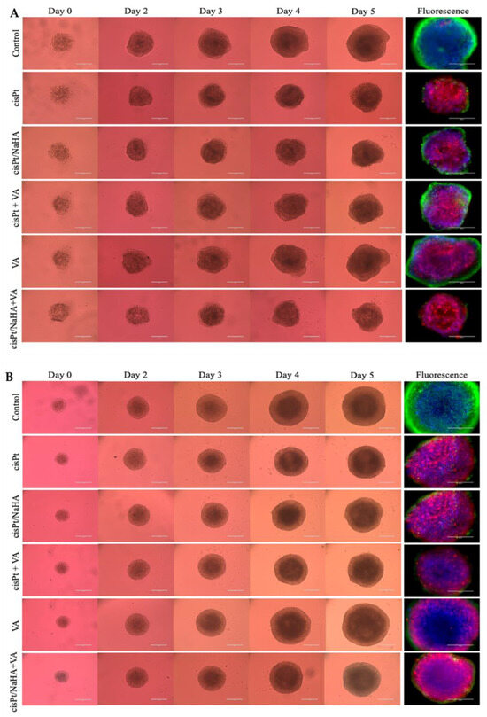 At time 0, the medium was removed from the well and 200 µL of test solution was added. Then, every other day, half of the medium was replaced with an equivalent volume of fresh medium containing cisPt or cisPt + VA at twice the concentration to test, until the end of the experiment. By doing so, the cells were maintained under the effect of constant drug concentration throughout the whole experiment duration. On a daily basis, the spheroid growth was visually monitored using an Evos imaging system (ThermoFisher Scientific, Waltham, MA, USA). In particular, the surface area was recorded as an indicator of the mass growth. The spheroid growth was expressed as daily fold change area relative to time 0 when the treatment was initiated. The duration of the experiment varied from 2 to 5 days depending on how much the spheroids grew under the effect of each treatment. The faster they grew, the shorter the experimental time. On the last day of the experiment, spheroids were stained with a mixture of three dyes: 1 µM calcein acetoxymethyl (calcein AM) for the green color, 6 µM ethidium homodimer-1 (EthD-1) for the red color and 4 μg/mL 4′,6-diamidino-2-phenylindole (DAPI) for the blue color (Santa Cruz Biotechnology, Dallas, TX, USA). The dyes were dissolved in sterile phosphate-buffered saline (PBS) and the obtained solution was used to completely replace the drug-containing medium in the well. Spheroids were then incubated with the dye solution for 3 h to let the dye penetrate inside the spheroid before imaging. Finally, fluorescent images were taken using an Evos fluorescence microscope (ThermoFisher Scientific, Waltham, MA, USA). The color of live and dead cells and nuclei were green, red, and blue, respectively.