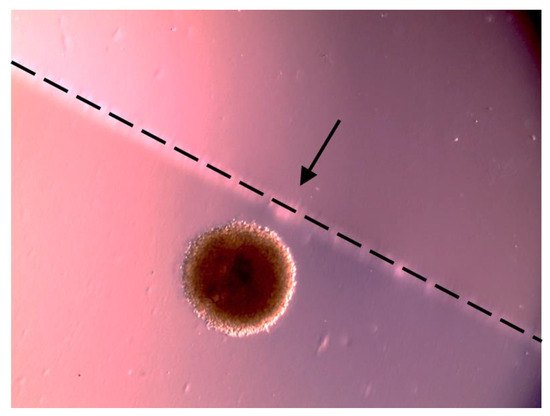 Optical microscopy image of the spheroid leaning on the film. The dashed line and the arrow indicate the outer edge of the film.