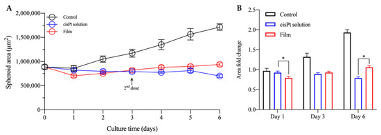 The film used in the experiments with spheroids was manufactured as described in Section 3.5. The preparation of spheroids was as described above with one difference. To test the hyaluronan film directly on spheroids, it was necessary to grow the cells to an initial area of 1 million µm2 prior to treatment, instead of the 20,000–30,000 µm2 that was suitable for the previous experiment. The larger the area of spheroids, the greater their integrity and resistance, which was required to transfer them safely from the 96 well-plate to a 6 well-plate. The larger well (9.6 cm2 vs. 0.32 cm2 for the 96 well-plate) allowed to hold the film flat at the bottom of the well. A piece of film was cut and weighed. The size of the piece was such that the cisPt concentration in contact with the spheroid would be 100 µM. The reference treatment group received a 25 µM cisPt solution in cell culture grade water added to the well at time 0. Then, at every 30 min for 6 h, half of the volume of the solution in the cisPt solution group was removed from the well and replaced with fresh medium without the drug. This caused a progressive dilution to zero of the drug in the well. This protocol was adopted to mimic the cisplatin clearance from the site of application, which is expected to be faster for the solution than for the film. The 30-min frequency was decided considering that cisPt shows a monoexponential decay in plasma with a half-life of 20 to 30 min following the intravenous administration of 50 or 100 mg/m2 [32].