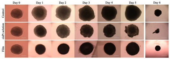 Representative images of VEM-resistant A375 spheroids treated with cisPt solution (25 µM) and film (cisPt 100 µM) following 6 days of treatment. Until Day 5 the magnification was 10× (scale bar: 400 µm), then it was 4x on the last day (scale bar: 1000 µm).