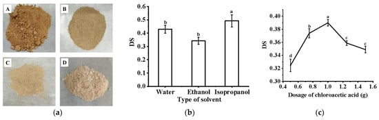 (a) The appearance characterization of Crude PFP (A), Deproteinizated PFP (B), PFP (C), CM-PFP (D); (b) Effect of solvent type on carboxymethylation effect; (c) Effect of chloroacetic acid dosage on carboxymethylation effect; (d) Effect of etherification temperature on carboxymethylation effect; (e) Effect of etherification time on carboxymethylation effect; (f) Effect of alkalization temperature on carboxymethylation (Different lowercase letters indicate statistical significance was determined using analysis of variance (ANOVA), and differences were considered statistically significant when p < 0.05.).