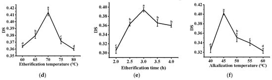 Single-factor experiments were used to explore five different carboxymethylation conditions and how they affected the DS. The solvent (water, ethanol, isopropanol), the temperature of alkalization (40 °C, 45 °C, 50 °C, 55 °C, and 60 °C), chloroacetic acid dosage (0.50, 0.75, 1.00, 1.25, and 1.50 g), temperature of etherification (60 °C, 65 °C, 70 °C, 75 °C, and 80 °C), and time of etherification (2.5 h, 3 h, 3.5 h, 4 h, and 4.5 h) were all investigated. Based on the single-factor experiments, the temperature of alkalization, the dosage of chloroacetic acid, the temperature of etherification, and the time of etherification were selected as factors, and the DS was used as the evaluation index. An orthogonal L9(34) experiment was designed to optimize the experimental conditions for carboxymethyl modification (Table S1a).