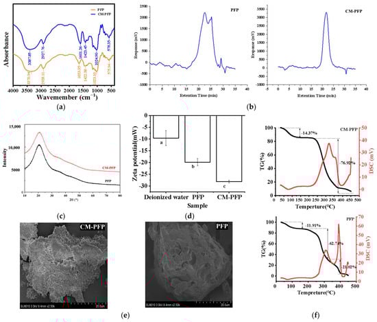 The zeta potential is an essential parameter for the dispersion characteristics of colloidal systems. It describes the nature of the charge on the surface of colloidal particles and can be used to analyze the interactions of charged particles in solution [18]. Higher zeta potential values represent stable solutions owing to the repulsion between highly charged particles, whereas lower zeta potential values reflect intermolecular forces overcoming repulsive forces to cause macromolecule aggregation [19]. As shown in Figure 2d, the Zeta potentials of PFP and CM-PFP were −19.88 ± 1.49 mV and −28.18 ± 0.54 mV, respectively. In this study, the absolute value of the zeta potential of PFP was low; therefore, the intermolecular repulsion was less than the attraction, and the molecules aggregated easily.