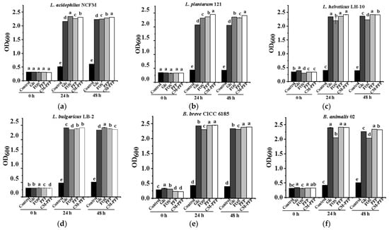 Compared to the control group, Glc, PFP, CM-PFP, and FOS significantly promoted the growth of the six Lactobacillus bacteria assessed after 48 h of culture (p < 0.05) (Figure 3a–f). The compounds were ordered as follows in terms of the effect of promoting growth: CM-PFP > PFP > Glc > Control. For L. acidophilus NCFM and L. plantarum 121, PFP and CM-PFP were significantly more proliferative than Glc and controls. However, after 24 h of culture, the FOS group had a more proliferative effect than PFP but less effective than CM-PFP (p < 0.05). In addition, L. helveticus LH-10 and L. bulgaricus LB-2 proliferated significantly better in PFP and CM-PFP media compared to FOS media (p < 0.05). The same results were observed for B. animals 02 and B. breve CICC 6185. Additionally, the proliferation of L. bulgaricus LB-2 was significantly lower on PFP and CM-PFP media than on Glc media (p < 0.05). After 48 h, the growth of the six Lactobacillus strains in PFP and CM-PFP media was considerably superior to that in the Glc group (p < 0.05). With the exception of L. bulgaricus LB-2, Lactobacillus strains grown on CM-PFP media were significantly more than those grown on FOS media (p < 0.05).