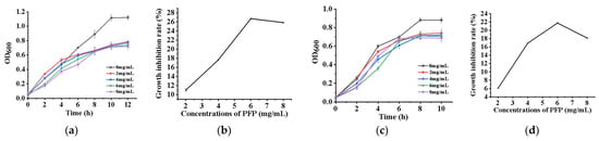 The inhibition experiments revealed that the OD600 of E. coli and S. aureus was less than that of the control group in the addition of PFP following 6 h of culture (Figure 4a,c). The inhibition of S. aureus and E. coli reached the maximum at 6.00 mg/mL of PFP in the growth media; the inhibition maxima were 26.71% and 21.75%, respectively (Figure 4b,d). These results indicated that PFP displayed inhibitory activity and sensitivity effects on E. coli and S. aureus. Antibacterial activity decreased as the PFP concentration was exceeded. The excessive PFP might be hydrolyzed by the Lactobacillus and is available for use.
