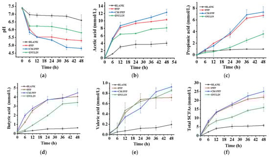 The fermentation medium was prepared and sterilized at 121 °C for 30 min. The carbohydrate-free medium served as the control, inulin-treated media as the positive control, PFP- and CM-PFP-treated media as the experimental groups. In vitro, fermentation was conducted at 37 °C for 48 h in an anaerobic environment. Specifically, a sterile test tube was placed with 0.3 mL of fecal suspension and 2.7 mL of growth medium. Samples were removed and placed in an ice-water bath for 20 min at 0 h, 6 h, 12 h, 24 h, 36 h, and 48 h to terminate fermentation. The supernatant was collected by centrifugation (8000× g rpm for 15 min), and the pH of the supernatant was measured. The sediment was collected in the −80 °C. Using the method described by Yang, short-chain fatty acids (SCFAs) in feces were detected using HPLC [8].