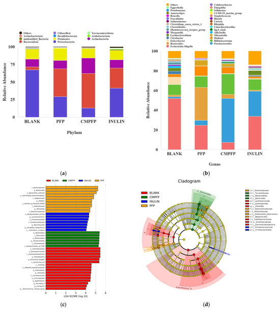 (a) Relative abundance of microbes in phylum; (b) Relative abundance of microbes in genus; (c) Histogram of the LDA scores across groups after 48 h of in vitro fecal fermentation; (d) Taxonomic cladogram across groups after 48 h of in vitro fecal fermentation.