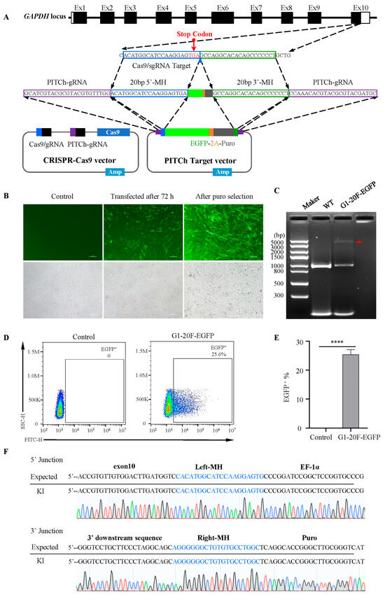 MMEJ-mediated gene knock-in at GAPDH locus in DF-1 cells. (A) A simplified schematic of PITCh-mediated EGFP knock-in into the 3′UTR of GAPDH. The CRISPR-Cas9 vector targeting near the stop codon at the 10th exon GAPDH is designed. The donor vector contains an EGFP cDNA connected to an EF-1α promoter for 3′UTR fusion. (B) DF-1 cells are transfected after 72 h, and stably transfected cells after puromycin selection are viewed under a fluorescence microscope. Scale bar: 100 µm. (C) PCR of the site-specific insertion in G1-20F-EGFP cell lines. The red arrow indicates the full length of the knock-in fragment. (D,E) Flow cytometry analysis of EGFP-positive cells 72 h after transfection. **** p < 0.0001; all values are presented as mean ± S.D. T-test was used to compare the WT with KI cells. (F) Sequencing analysis of stably transfected G1-20F-EGFP cell lines.