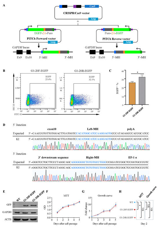 Comparisons between the forward and reverse insertions. (A) Construction of an all-in-one CRISPR-Cas9 vector harboring Cas9 nuclease and two gRNAs, a GAPDH target gRNA, and a generic PITCh-gRNA (left). Construction of the donor vector expressing EGFP linked forward and reverse (right). (B,C) Flow cytometry analysis of G1-20F-EGFP- and G1-20R-EGFP-positive cells 72 h after transfection. * p = 0.0175; all values are presented as mean ± S.D. T-test was used to compare. (D) Sequencing analysis of stably transfected G1-20R-EGFP cell lines. (E) Western blots of EGFP protein, GAPDH, and ACTB for Control, G1-20F-EGFP, and G1-20R-EGFP cell lines. (F–H) MTT assay, * p < 0.05; NS, not significant. T-tests were used after one-way ANOVA.
