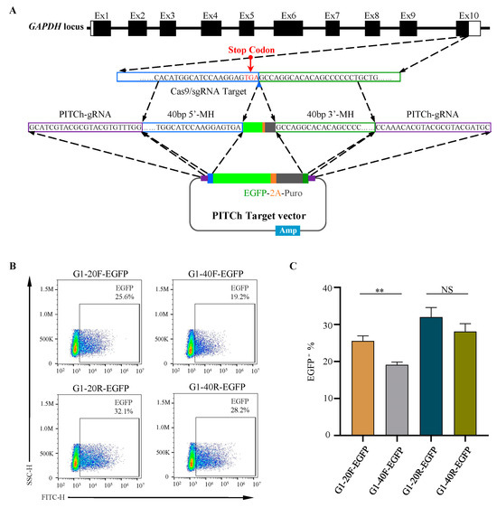 Comparisons between short and long homologous arms. (A) A schematic illustration of donor vector construction harboring 40 bp microhomologies. (B,C) Flow cytometry analysis of EGFP-positive cells 72 h after transfection for different PITCh vectors. ** p = 0.0019; NS, not significant. All values are presented as mean ± S.D. T-test was used after one-way ANOVA.