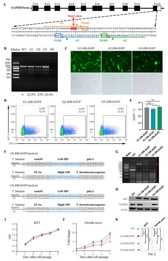 Insertion in different target sites caused diverse effects. (A) A schematic illustration of three locus-specific gRNAs targeting GAPDH: G1, G2, and G3. (B) T7 endonuclease Ⅰ assay of the GAPDH gene mutation in DF-1 cells. (C) DF-1 cells were transfected after 72 h under a fluorescence microscope. Scale bar: 100 µm. (D,E) Flow cytometry analysis of EGFP-positive cells 72 h after transfection for G1-20R-EGFP, G2-20R-EGFP, and G3-20R-EGFP. * p = 0.0334; NS, not significant. All values are presented as mean ± S.D. T-test was used after one-way ANOVA. (F) Sequencing analysis of stably transfected G2-20R-EGFP and G3-20R-EGFP cell lines. (G) PCR of the site-specific insertion in stably transfected EGFP cell lines. The red arrow indicates the full length of the knock-in fragment. (H) Western blots of EGFP protein, GAPDH, and ACTB for Control, G1-20R-EGFP, G2-20R-EGFP, and G3-20R-EGFP cell lines. (I–K) MTT assay, from right to left; NS, not significant; *** p = 0.001, *** p = 0.006. Growth curve, from left to right; NS, not significant; ** p = 0.0012, ** p = 0.0017. All values are presented as mean ± S.D. T-tests were used after one-way ANOVA.