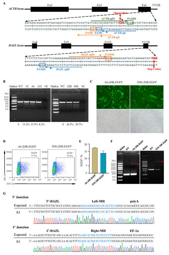 MMEJ-mediated gene knock-in at ACTB and DAZL loci in DF-1 cells. (A) sgRNA design for gene integration at ACTB and DAZL loci. (B) T7 endonuclease Ⅰ assay of the mutation in DF-1 cells. (C) DF-1 cells were transfected by targeted vectors after 72 h under a fluorescence microscope. Scale bar: 100 µm. (D,E) Flow cytometry analysis of EGFP-positive cells 72 h after transfection for A6-20R-EGFP and D36-20R-EGFP. (F) PCR of the site-specific insertion in stably transfected cell lines. The red arrow indicates the full length of the knock-in fragment (ACTB: 3476 bp and DAZL: 3729 bp). (G) Sequencing analysis of stably transfected DAZL36-EGFP cell lines.