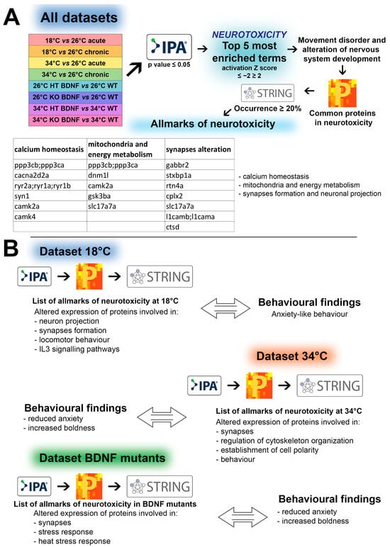 Workflow of the systematic analysis of the proteomic data. (A) Analysis conducted using IPA (significance level set at p ≤ 0.05) starting from the proteins showing differential expression in all datasets, reported in Tables S1–S8 adapted from [9,10,12]. (B) Analysis of the separate datasets of WT at 18 °C, WT at 34 °C, and BDNF mutants (HT and KO) at both 26 °C and at 34 °C. Experimental details are reported in the Section 4. All the lists of allmarks of neurotoxicity are reported in Table S12.